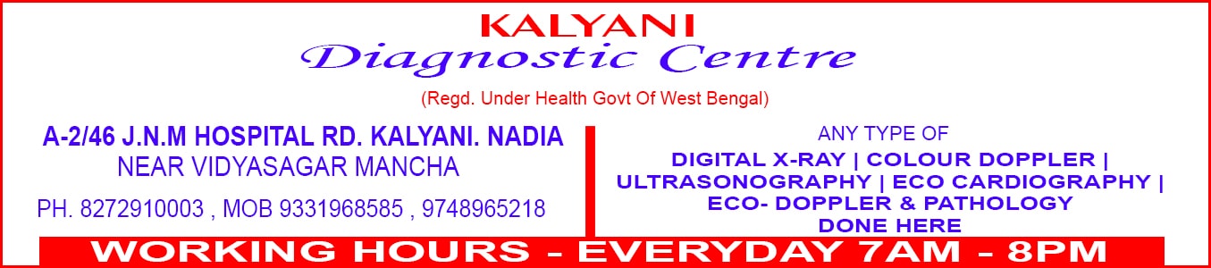 Kalyani Diagnostic is one of the most experienced diagnostics located in Kalyani. This path lab is located at JNM Hospital Road. Kalyani, Near Vidyasagar Mancha. Any type of Digital X-Ray, Colour Doppler, Ultrasonography, ECO Cardiography, ECO Doppler & Pathology tests are available here. Apart From This Kalyani Diagnostics also hosts Reputed doctors from Different Category. Being one of the best diagnostic centers in Kalyani our commitments towards patients makes us more special. We also provide online booking facility for doctors.